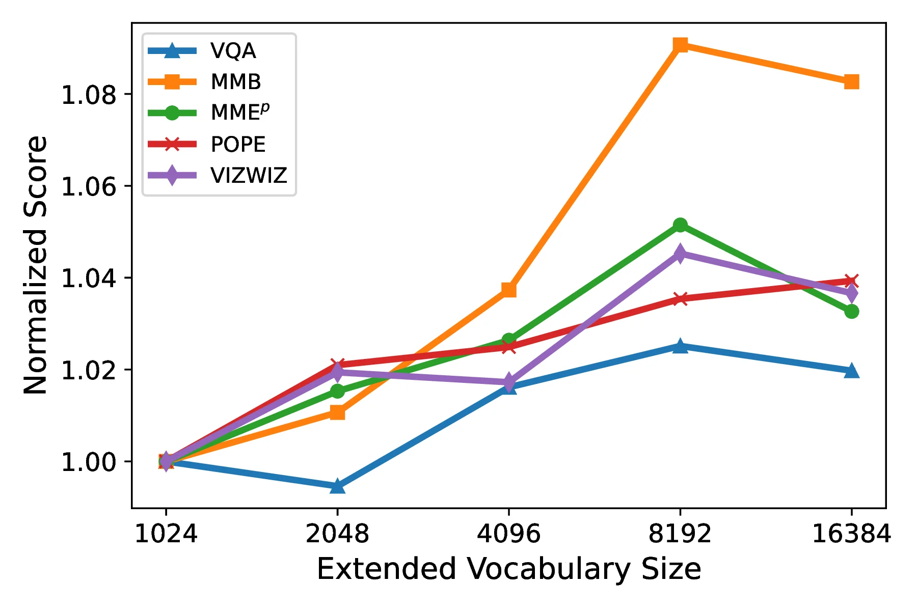 We study how the BPE vocabulary size affects performance and how the model distributes weight across original VQ tokens versus merged tokens. The sweet spot appears near an 8K extended vocabulary, balancing fine-grained details with higher-level semantics.