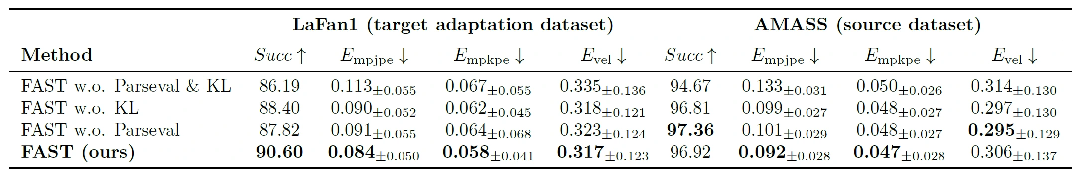 Abaltions on fast adaptation results on target adaptation dataset (LaFan1) and source dataset (AMASS). The result demonstrates that combining Parseval and KL regularization enables fast adaptation with a favorable balance between target-domain performance and source-domain preservation.