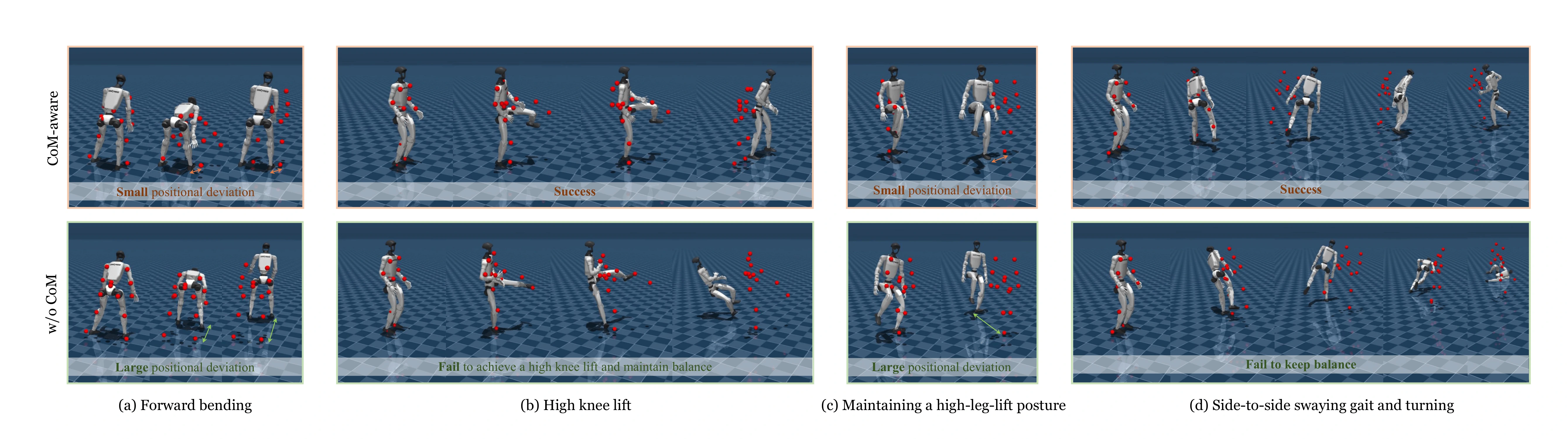 Visualizations of representative motions comparing CoM-Aware Control with the baseline. CoM-Aware Control consistently maintains balance and reduces instability, while the baseline exhibits drift or falls.