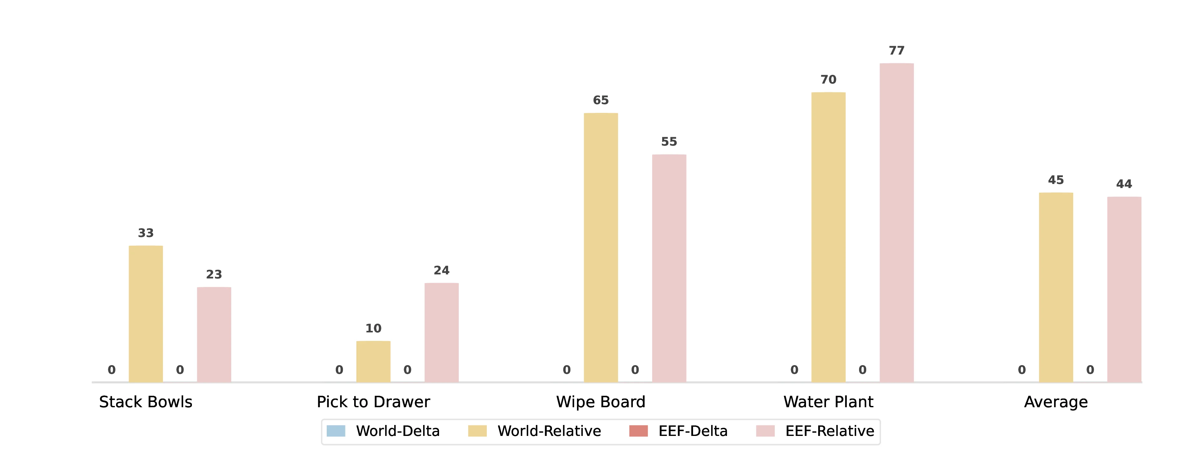 - Real-World Results: EEF-Delta actions exhibit severe jittering and become unusable in real-robot deployment (0% in blind evaluation), while relative-coordinate variants execute effectively; in this setting, World-Relative and EEF-Relative show no significant performance gap.