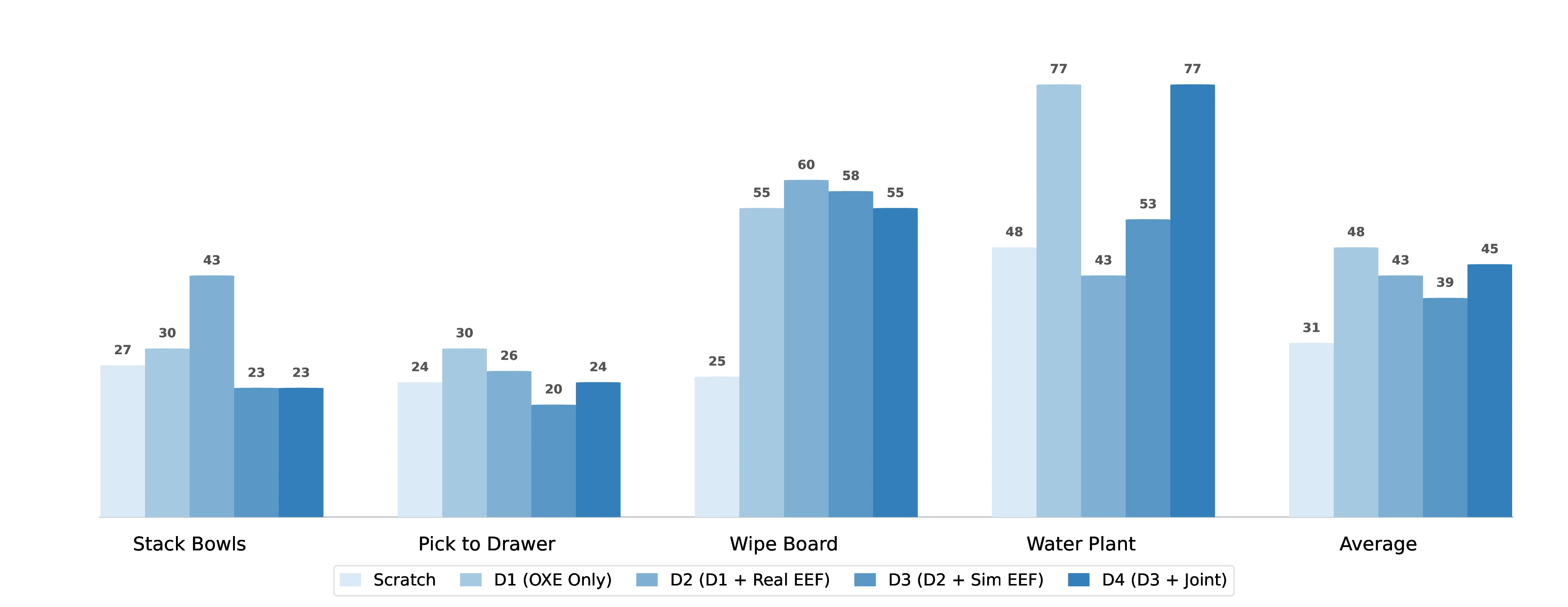 - Real-World Results: In blind real-robot evaluation, all pre-training mixtures (D1-D4) outperform training from scratch, while D1 remains the most robust setting. Adding simulated EEF trajectories introduces task-dependent degradation, especially on Stack Bowls, Pick-to-Drawer, and Wipe Board.