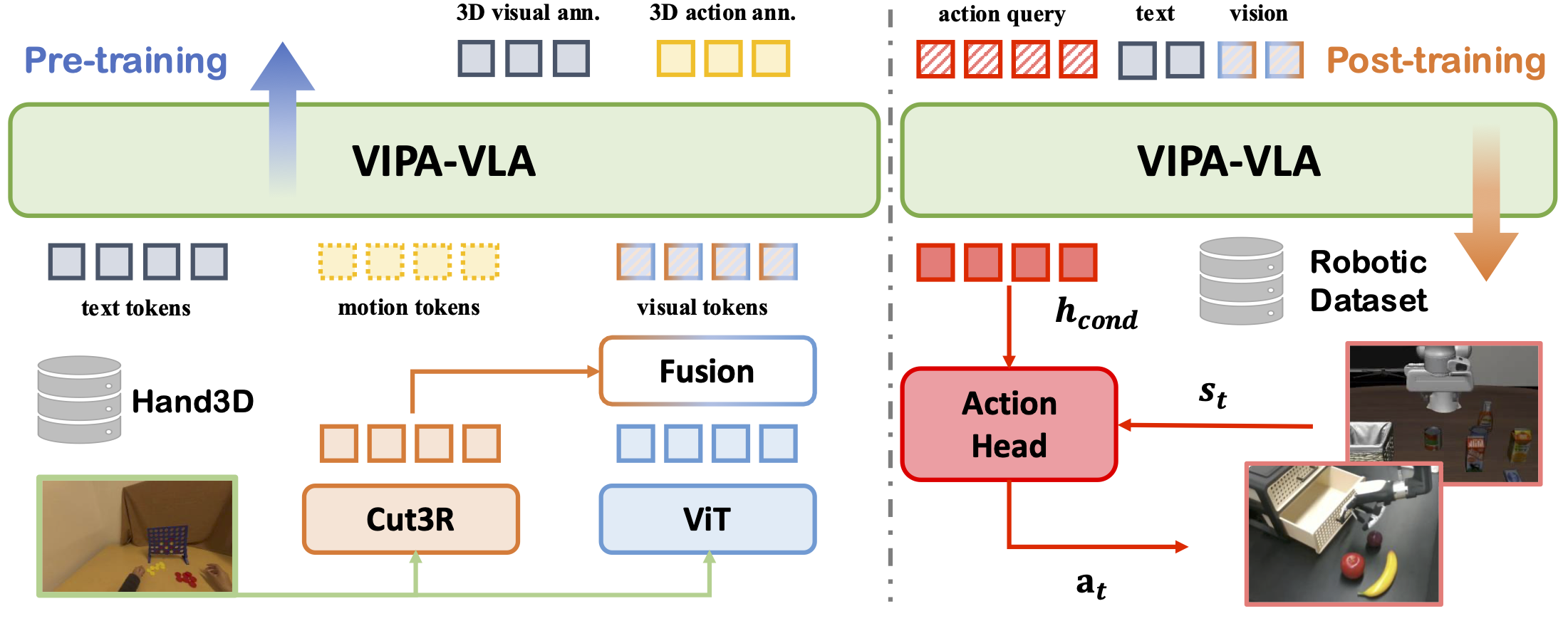 VIPA-VLA adopts a dual-encoder design that integrates a semantic visual encoder with a 3D spatial encoder. A lightweight fusion module aligns and combines their representations through cross-attention, producing spatially grounded features. During post-training, an action query interacts with these fused features, and a flow-matching action head predicts continuous 3D actions conditioned on robot states.